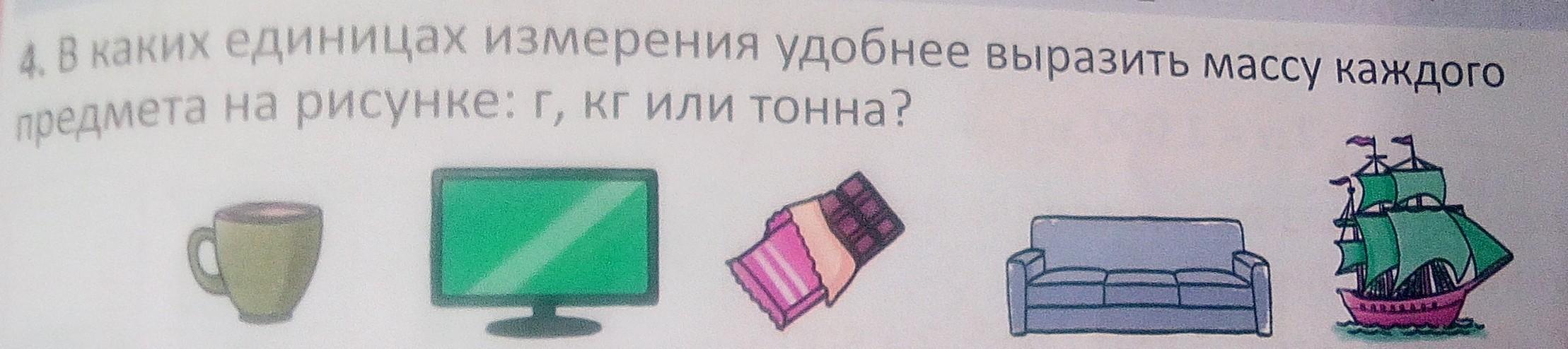 Ответ: чашка,шоколадка = г; диван и телевизор кг; корабль тонна