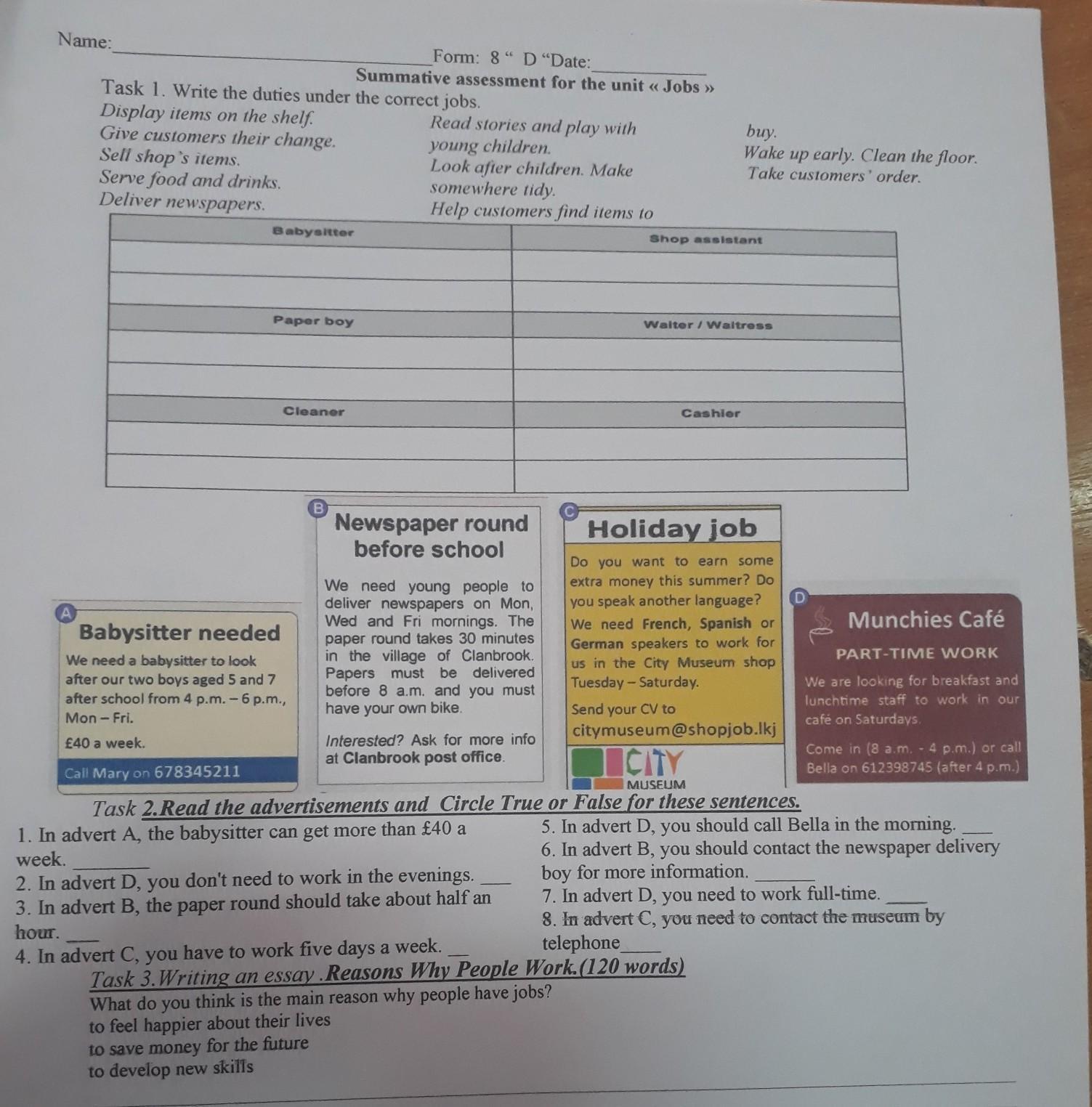 помогите срочно надо дам 100баллов Task 1. Write the duties under the correct jobs. Display items on the shelf. Give customers their change. Read stories and play with young children. Look after children. Make somewhere tidy. Help customers find items to Sell shop's items. Serve food and drinks. Deliver newspapers. Babysitter Paper boy Cleaner buy. Wake up early. Clean the floor. Take customers' order. Shop assistant Waiter/Waitress Cashier
