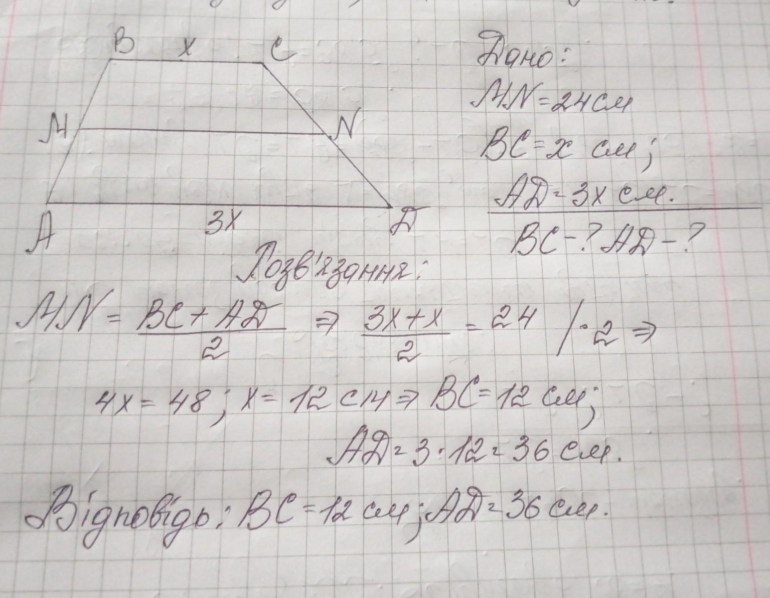 середня лінія трапеції дор 24см знайдіть основи трапецій якщо одна з них утричі більша за іншу