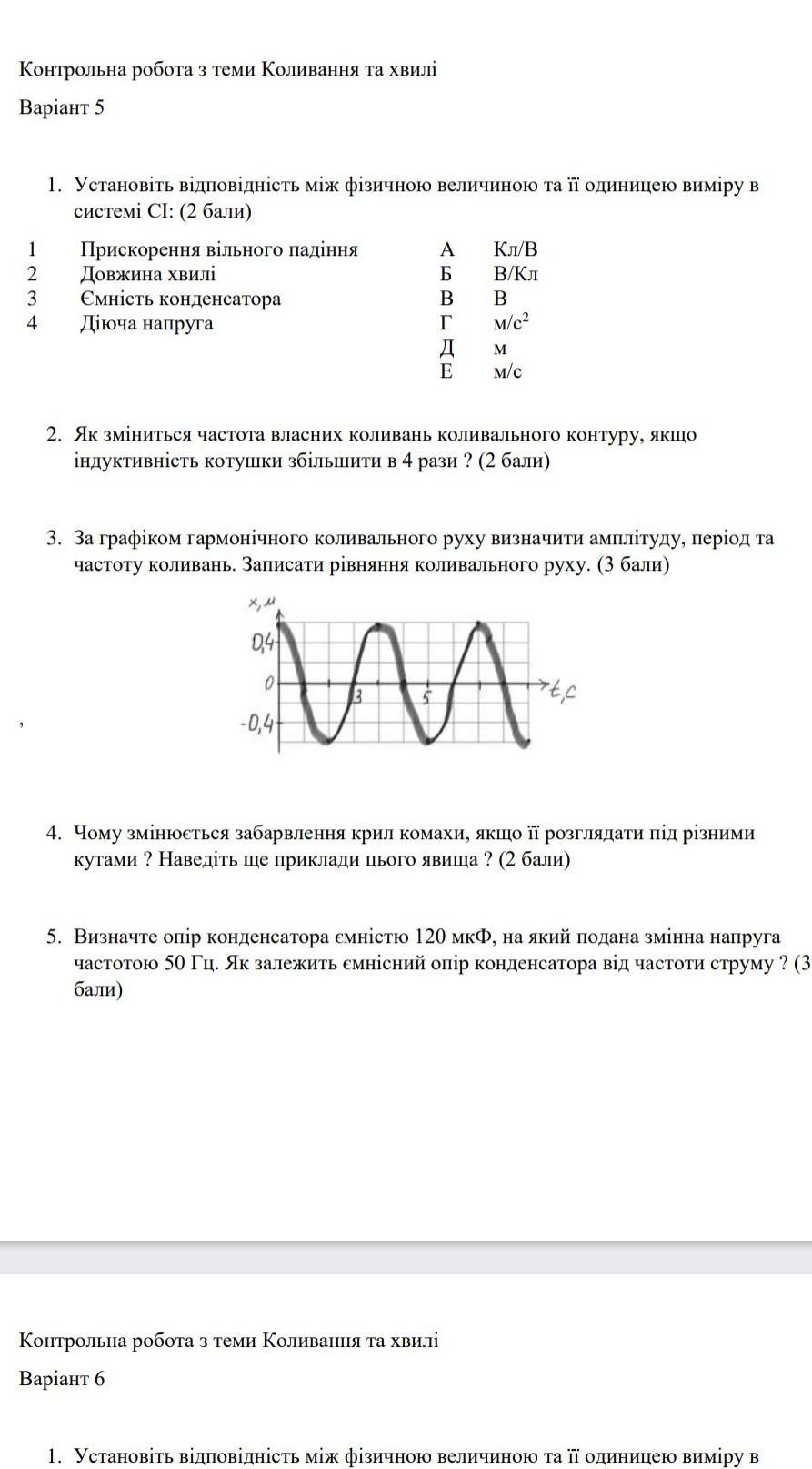 Контрольна робота з теми Коливання та хвилі Варіант 5 1. Устiдповiднiсть між фізичною величиною та її одиницею виміру в системi CI: (2 бали) 1 Прискорення вільного падіння 2 Довжина хвилі 3 Ємність конденсатора 4 Діюча напруга x,m 0,4 0 A Б -0,4 B Г Д E 2. Як зміниться частота власних коливань коливального контуру, якщо індуктивність котушки збільшити в 4 рази ? (2 бали) ш Кл/B В/Кл 3. За графіком гармонічного коливального руху визначити амплітуду, період та частоту коливань. Записати рівняння коливального руху. (3 бали) B м/с2 M м/с 4. Чому змінюється забарвлення крил комахи, якщо її розглядати під різними кутами ? Наведіть ще приклади цього явища ? (2 бали) 5. Визначте опір конденсатора ємністю 120 мкФ, на який подана змінна напруга частотою 50 Гц. Як залежить ємнісний опір конденсатора від частоти струму ? (3 бали)