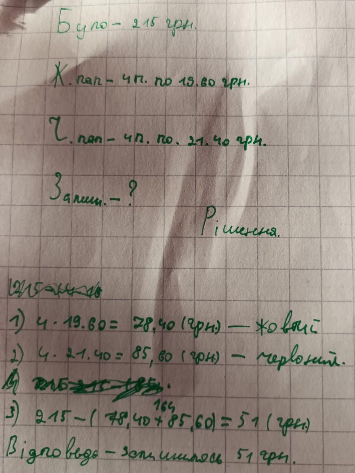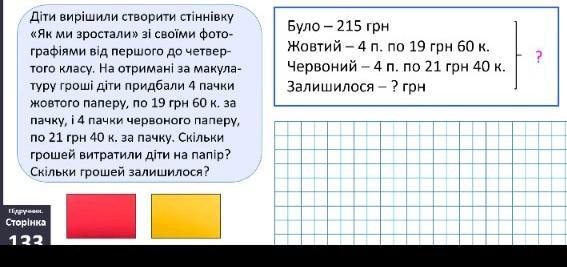 Діти вирішили створити стіннівку «Як ми зростали зi своïми фото- графіями від першого до четвер- того класу. На отриманi за макула- туру гроші діти придбали 4 пачки жовтого паперу, по 19 грн 60 к. за пачку, і 4 пачки червоного паперу, по 21 грн 40 к. за пачку. Скільки грошей витратили діти на папір? Скільки грошей залишилося?