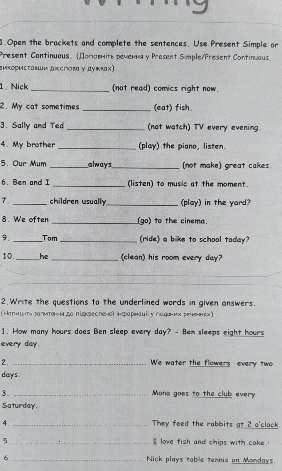 ex1. 1. isn't reading 2. eats 3. don't watch 4. is playing 5. doesn't slways make 6. are listening 7. Do children usually play 8. go 9. Does Tom ride 10. Does he clean his room every day?
