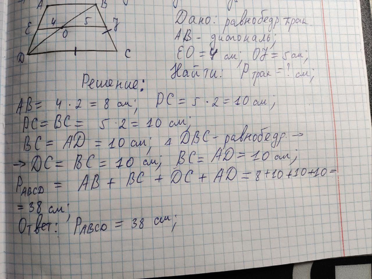 Діагональ рівнобічної трапеції ділить навпіл її тупий кут, а середню лінію трапеції на вiдрiзки 4 см і 5 см. Знайдіть периметр трапеції.