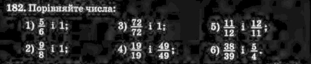 182. Порівняйте числа: 1) 5/6 і 1; 2) 9/8 i 1; 3) 72/72 i 1: 4) 19/19 і 49/49 5) 11/12 і 12/11; 6)38/39 і 5/4 спаситееееее
