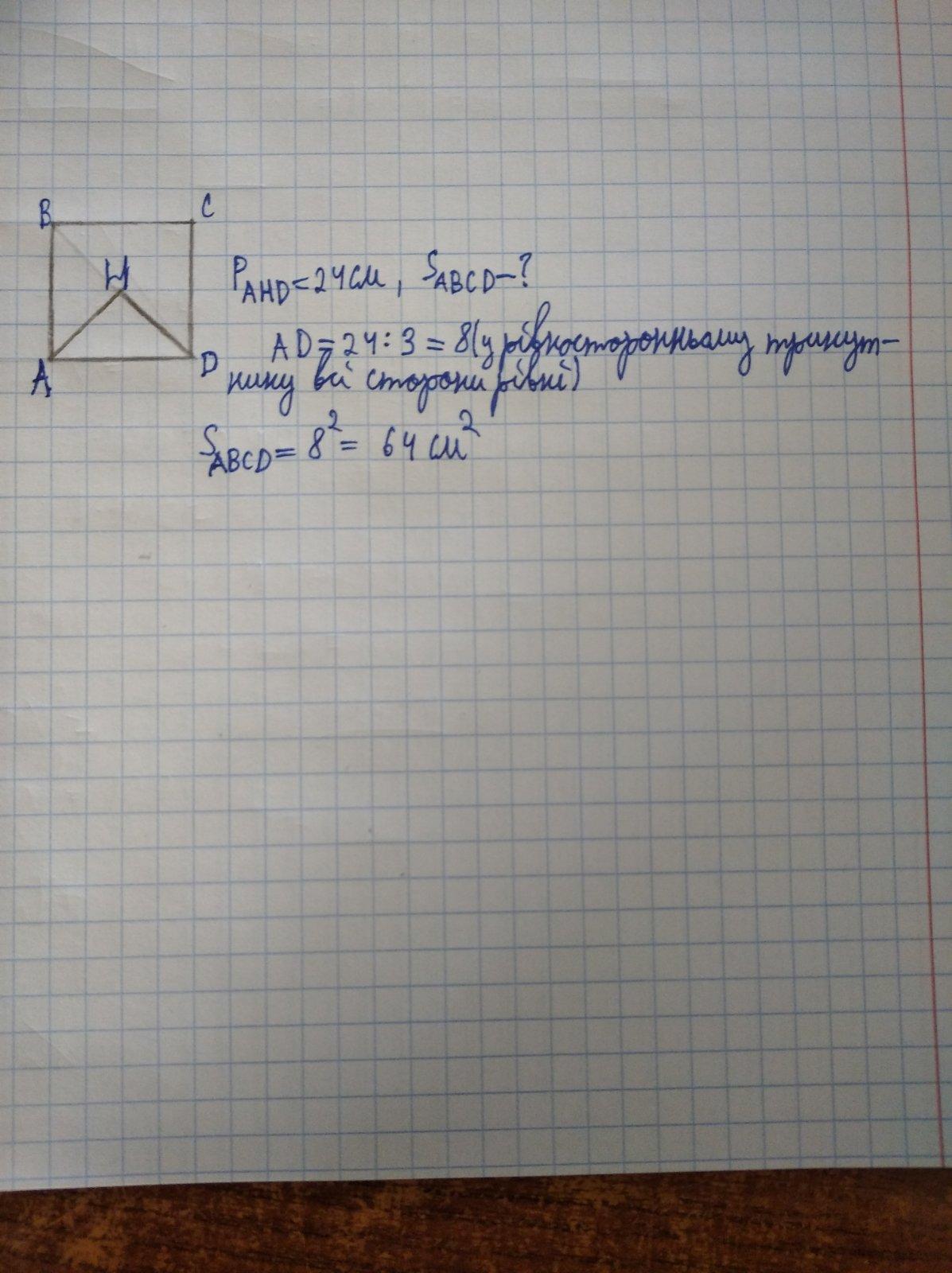 На стороні квадрата побудовано рівносторонній трикутник. Периметр трикутника дорівнює 24см,обчислити площу квадрата (у відповідь записуємо тільки числове значення, без одиниць вимірювання)