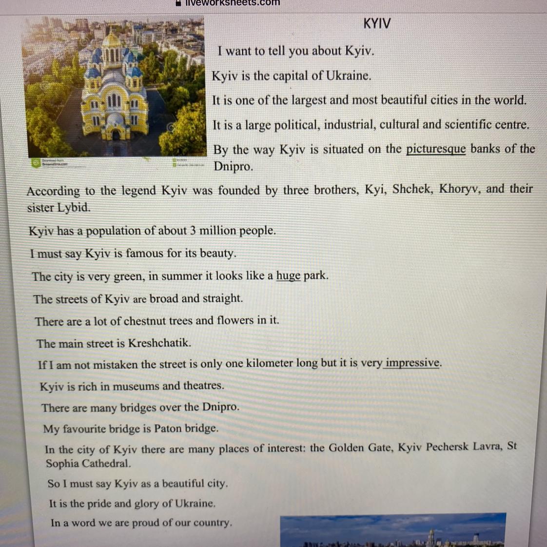 I want to tell you about Kyiv. Kyiv is the capital of Ukraine. It is one of the largest and most beautiful cities in the world. Dnipro. In a word we are proud of our country. It is a large political, industrial, cultural and scientific centre. By the way Kyiv is situated on the picturesque banks of the According to the legend Kyiv was founded by three brothers, Kyi, Shchek, Khoryv, and their sister Lybid. Kyiv has a population of about 3 million people. I must say Kyiv is famous for its beauty. The city is very green, in summer it looks like a huge park. The streets of Kyiv are broad and straight. There are a lot of chestnut trees and flowers in it. The main street is Kreshchatik. If I am not mistaken the street is only one kilometer long but it is very impressive. Kyiv is rich in museums and theatres. There are many bridges over the Dnipro. My favourite bridge is Paton bridge. In the city of Kyiv there are many places of interest: the Golden Gate, Kyiv Pechersk Lavra, St Sophia Cathedral. So I must say Kyiv as a beautiful city. It is the pride and glory of Ukraine. Завдання на фото