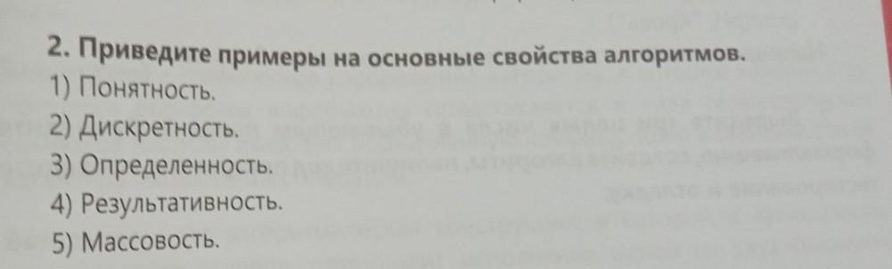 2. Приведите примеры на основные свойства алгоритмов. 1) Понятность. 2) Дискретность, 3) Определенность. 4) Результативность. 5) Массовость.