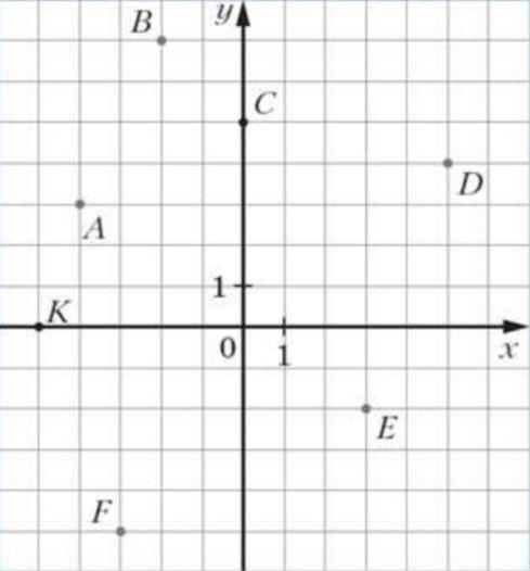 Ответ: B (-2, 7) C (0, 6) K (0, -5) F (-3, -5) E (3, -2) D (5, 4)