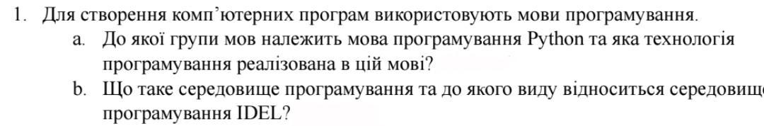5. Середовище програмування (IDE - Integrated Development Environment) - це програмне забезпечення для розробки програмного забезпечення, яке містить в собі різноманітні інтегровані інструменти, такі як текстовий редактор, компілятор, дебагер тощо. Середовище програмування IDEL відноситься до виду інтерактивного середовища програмування (Interactive Development Environment) і розроблене для мови програмування Python.