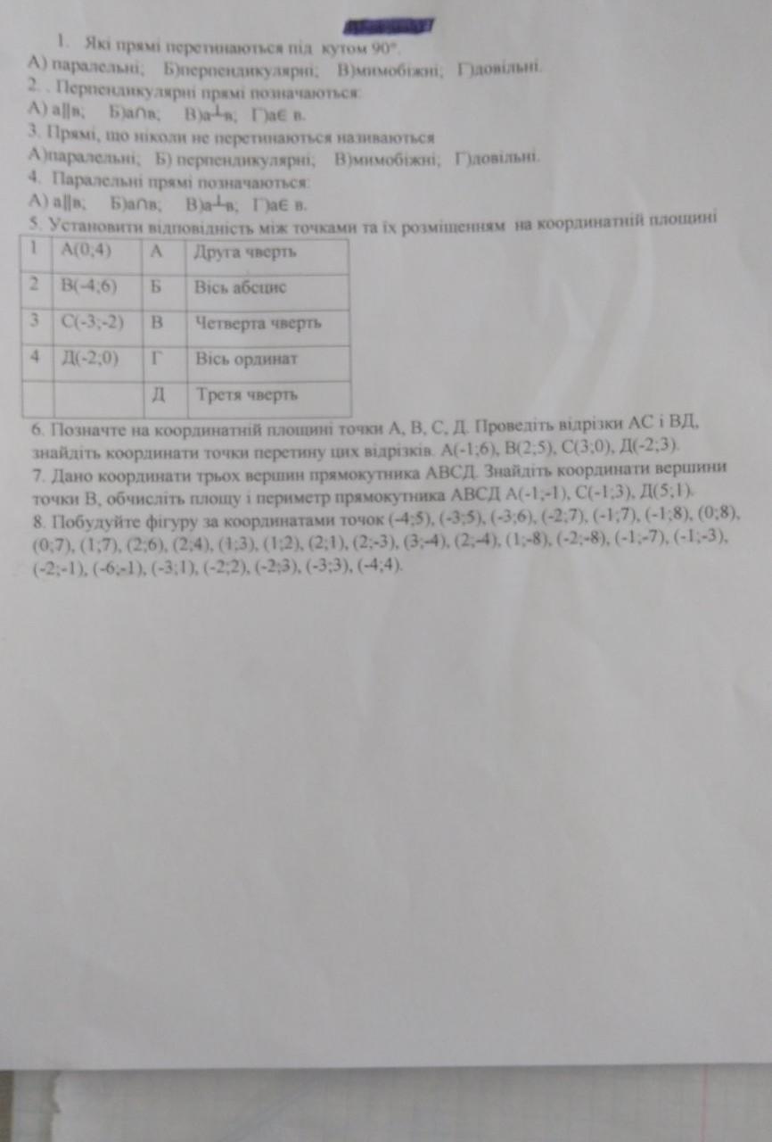 1. Які прямі перетинаються під кутом 90 А) паралельнi Б)пер В)мимобн. Г)довiльнi 2. Перпендикулярні прямі позначаються