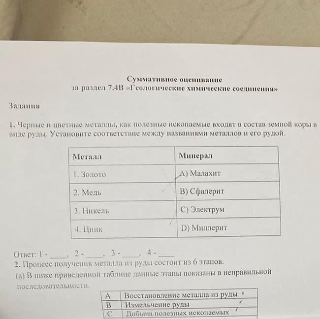 виде руды. Установите соответствие между названиями металлов и его рудой.