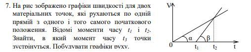 На рис зображено графіки швидкості для двох матеріальних точок, які рухаються по одній прямій з одного і того самого початкового положення. відомі моменти часу t1 і t2. знайти, в який момент часу t3 точки зустрінуться. побудувати графіки руху.
