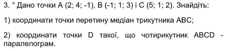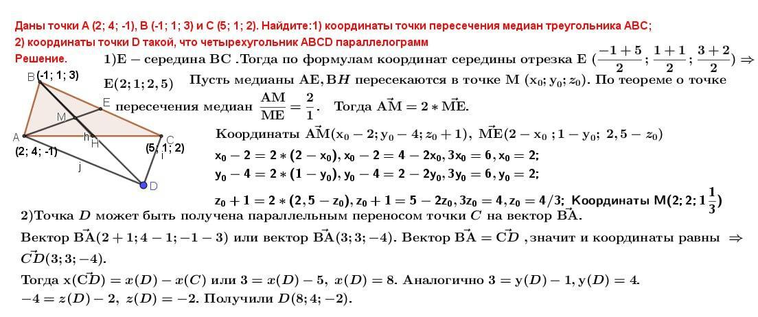 1) координаты точки пересечения медиан треугольника АВС; 2) координаты точки D такой, что четырехугольник ABCD параллелограмм.