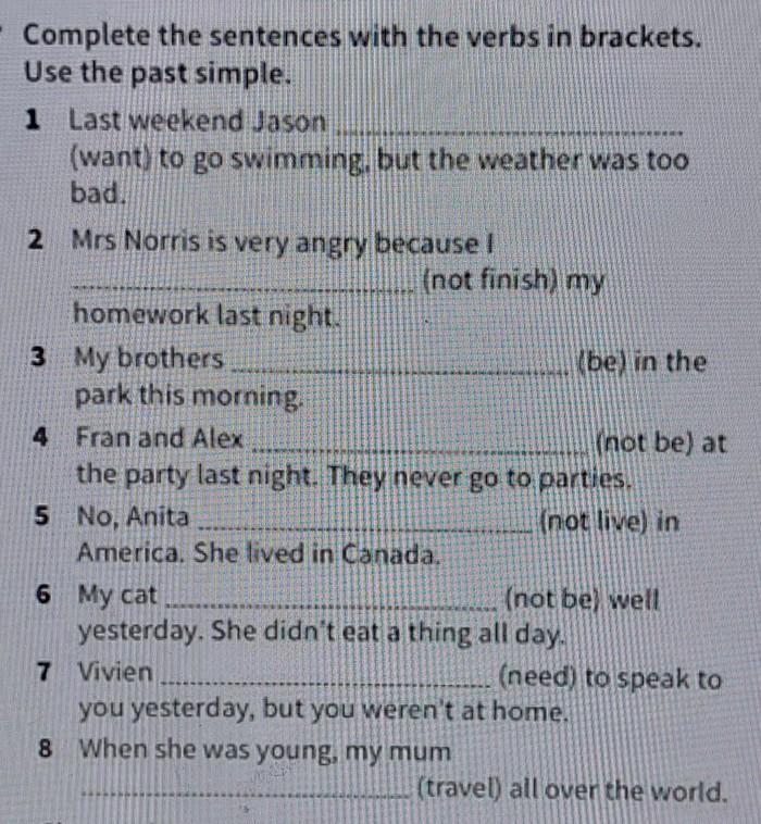Complete the sentences with the verbs in brackets. Use the past simple. 1 Last weekend Jason ----- (want) to go swimming, but the weather was too bad. 2 Mrs Norris is very angry because I homework last night. 3 My brothers DEZE park this morning. (not finish) my 4 Fran and Alex the party last night. They never go to parties. 5 No, Anita (not live) in America. She lived in Canada. 6 My cat yesterday. She didn't eat a thing all day. (be) in the 7 Vivien you yesterday, but you weren't at home. 8 When she was young, my mum (not be) at (not be) well (need) to speak to (travel) all over the world.