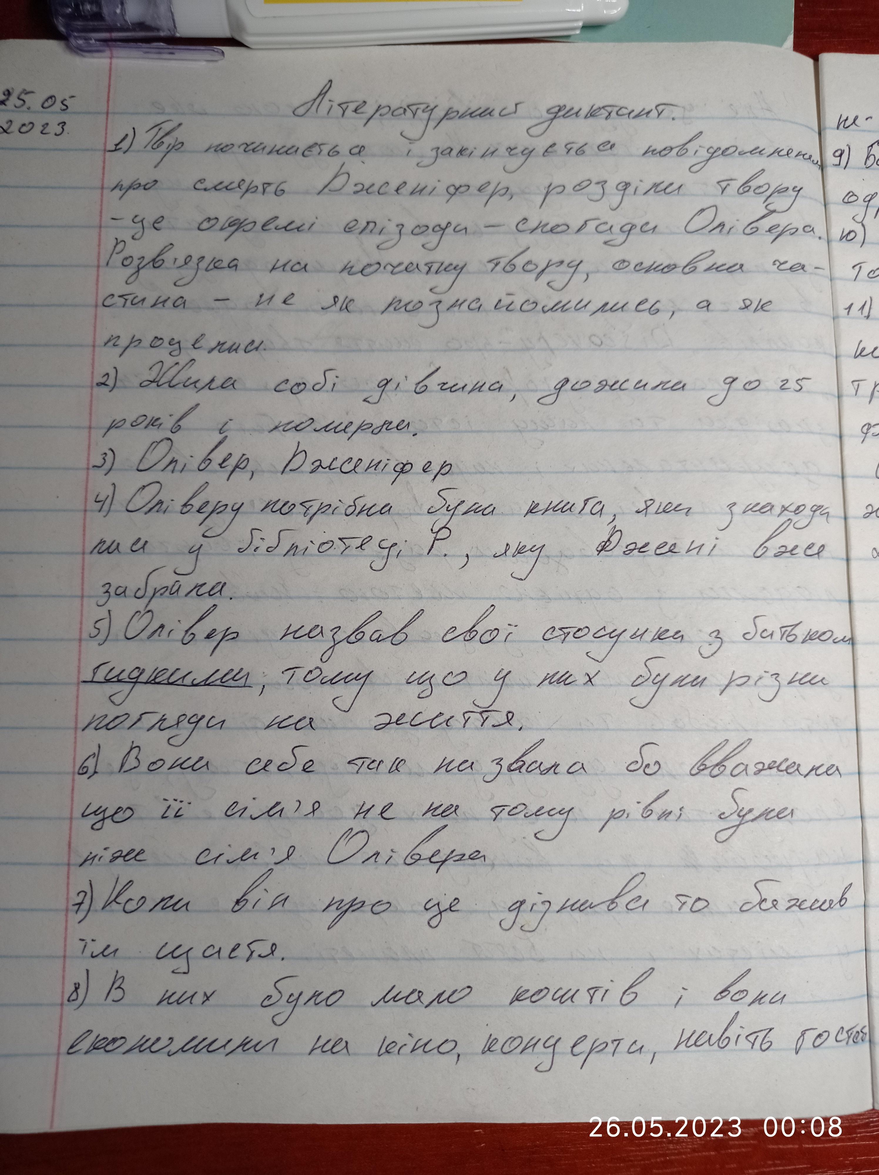 1. У чому полягае собливість композиційно побудови повісті. 2. Якими словами поч повість. 3. Імена головних героїв. 4. За яких обставин вони познайомилися. 5. Опить в декількох словах стосунки Олівера iз батьком. 6. Чому Джені називала себе "соціальним нулем". 7. Як поставився до новини про одруження Філ. 8. Опишіть перші роки подружнього життя Джені і Олівера. 9. Як поставився до звістки про одруження головних героїв Олівер Беррет III. 10. Поясніть причину неймовірного успіху повісті. 11. Проведіть смислову паралель мiж iсторiєю кохання Олівера і Джені, та Ромео і Джульєтти. Знайдіть спільне і вiдмiнне.