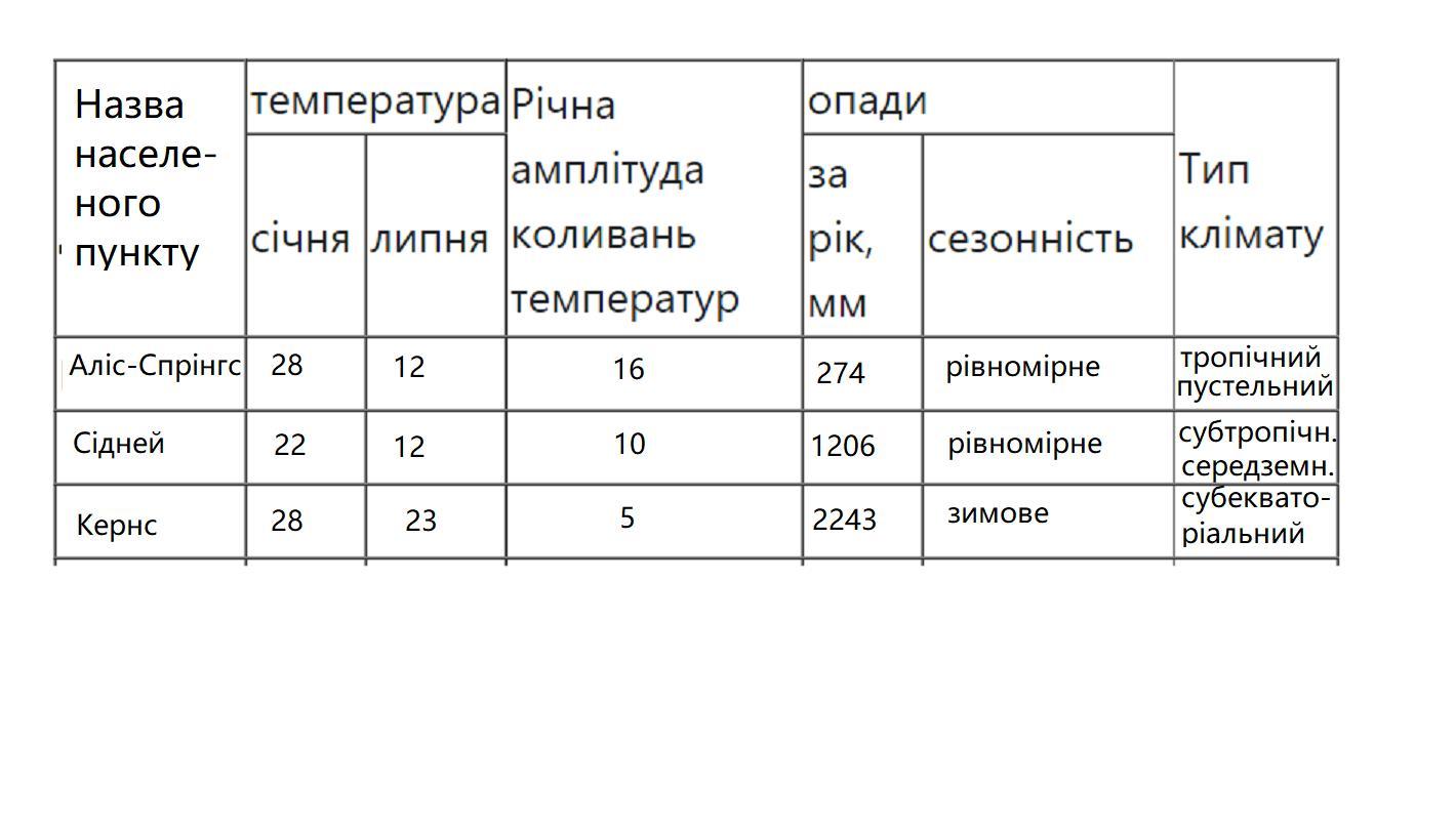 - Проаналізувавши наведені кліматичні діаграми з різних частин Австралії, ми заповнили таблицю й визначили типи клімату.