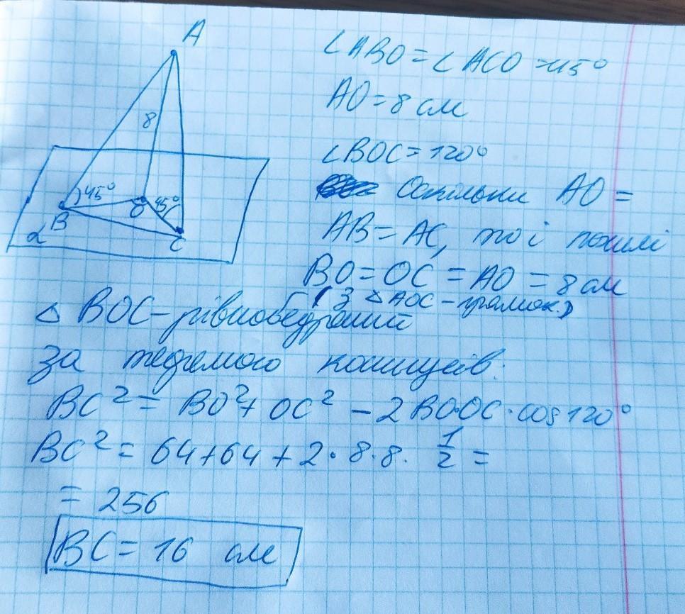 Із точки А. віддаленої від площини на 8 см, проведені дві похилі АВ і АС під кутом до площини 45°. Знайдіть відстань ВС між основами похилих, якщо проекції похилих утворюють кут 120°.