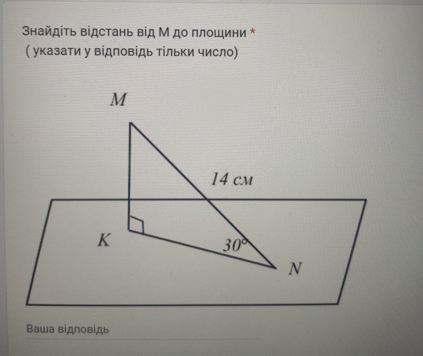 трикутник прямокутний. MK є перпендикуляром до площини, отже і є відстанню від точки M до цієї площини. З прямокутного трикутника: