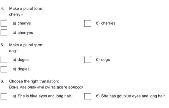 4. cherries - б) 5. dogs - б) 6. she has got blue eyes and long hair - б)