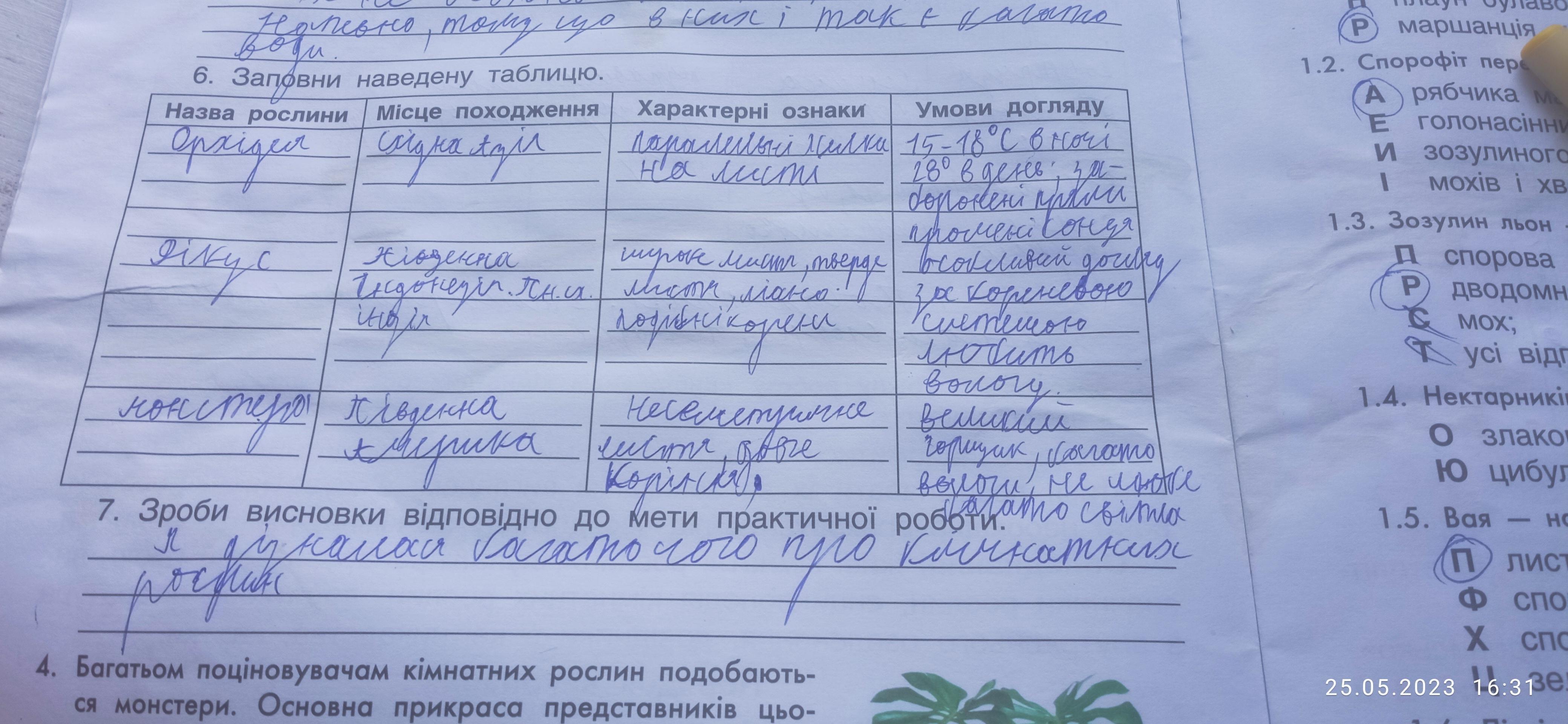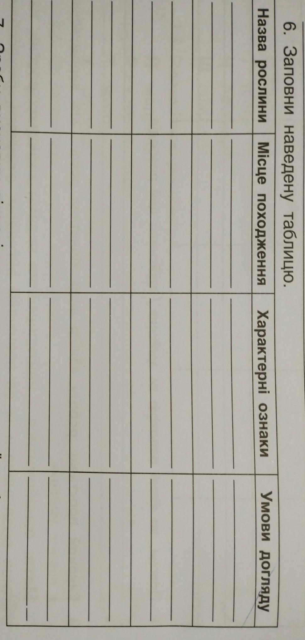6. Заповни наведену таблицю. Назва рослини Місце походження Характерні ознаки Умови догляд. Даю 100 балов!!!!!!!