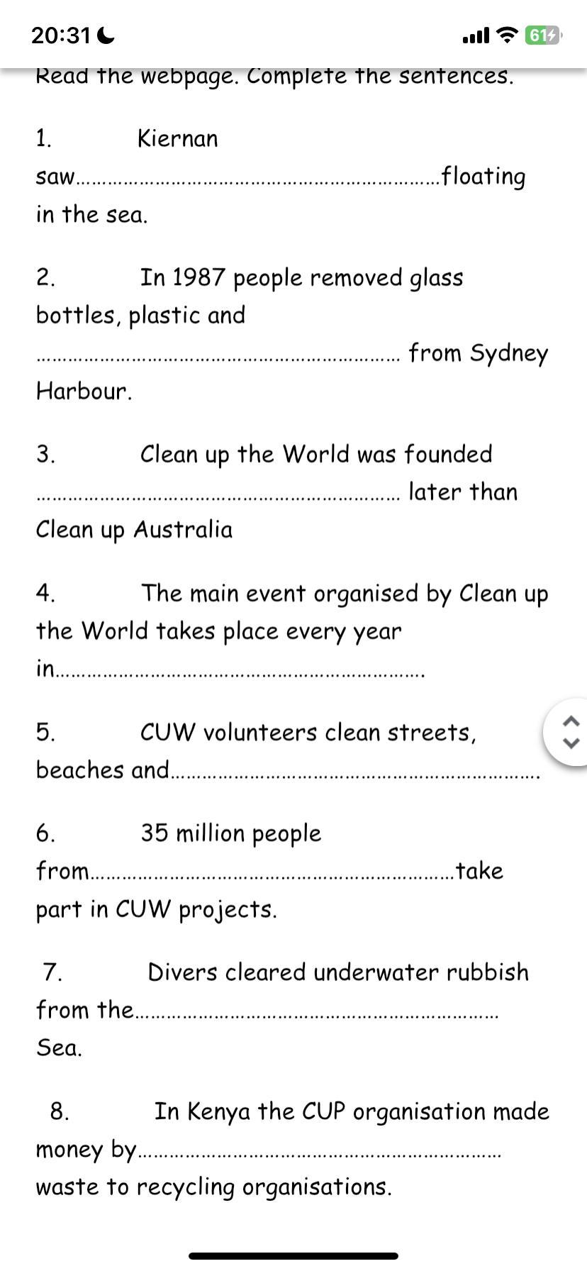 When he returned home to Sydney in the same year, he organised a special event called Clean up Sydney Harbour Day. Over 40,000 volunteers cleared away old cars, glass bottles and plastic of all kinds. It was so successful that he started Clean up Australia in 1990, and then three years later, the Clean up the World (CUW) project was founded. CUW is a campaign that inspires and encourages people worldwide to clean up and protect their environment. The organisation’s main annual event is Clean up the World weekend in September each year. During the weekend, over 600 groups from every continent clear waste from beaches, river banks and streets.