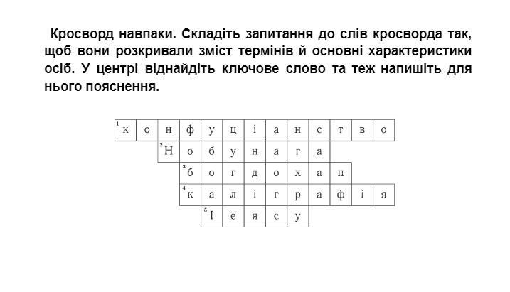 Кросворд навпаки. Складіть запитання до слів кросворда так, щоб вони розкривали зміст термінів й основні характеристики осіб. У центрі віднайдіть ключове слово та теж напишіть для нього пояснення.