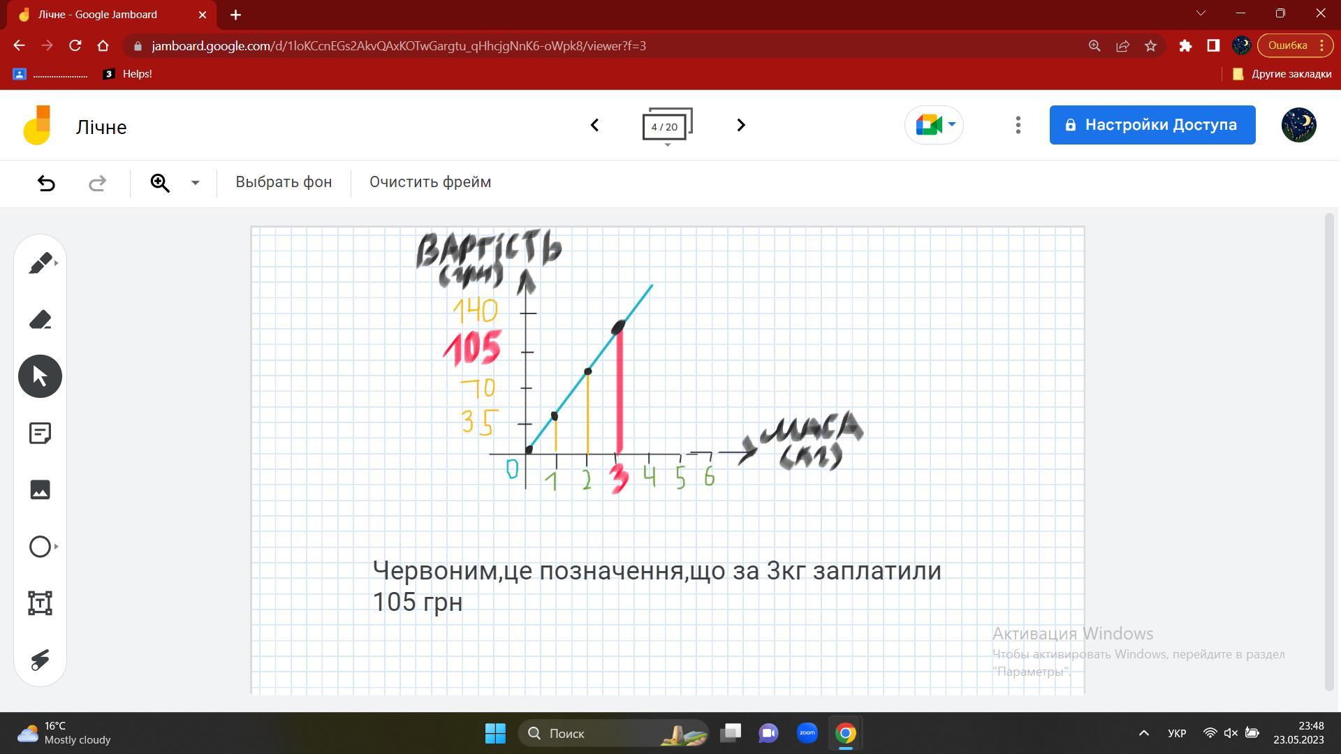 Точка стоїть навпроти 105(грн)і також поєднує з числом 3(кг).