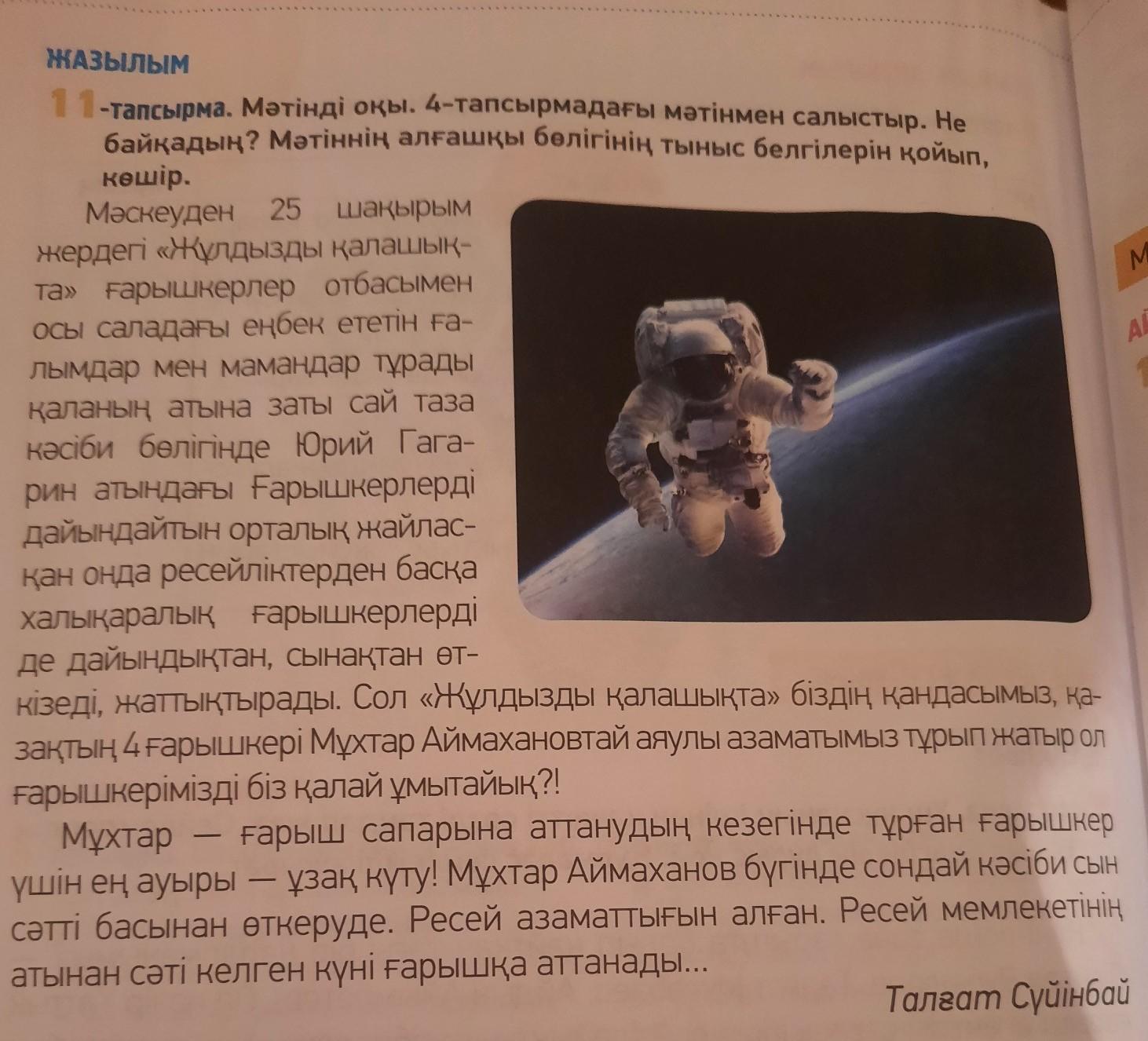 ЖАЗЫЛЫМ 11-тапсырма. Мәтiндi окы. 4-тапсырмадағы мәтінмен салыстыр. Не байқадың? Мәтіннің алғашқы белiгiнiң тыныс белгiлерiн койып, көшір. Мәскеуден 25 шақырым жердегі «Жулдызды қалашық- та>> ғарышкерлер отбасымен осы саладағы еңбек ететiн ға- лымдар мен мамандар тұрады каланың атына заты сай таза кәсіби бөлігінде Юрий Гага- рин атындағы Ғарышкерлерді дайындайтын орталык жайлас- кан онда ресейліктерден басқа халықаралық ғарышкерлерд де дайындықтан, сынақтан өт- кiзедi, жаттықтырады. Сол «Жұлдызды қалашықта» біздің қандасымыз, ка- зақтың 4 ғарышкері Мұхтар Аймахановтай аяулы азаматымыз тұрып жатыр ол ғарышкерімізді біз қалай ұмытайық?! Мұхтар-ғарыш сапарына аттанудың кезегінде тұрған ғарышкер үшін ең ауыры - ұзақ күту! Мұхтар Аймаханов бугінде сондай кәсiби сын сәтті басынан өткеруде. Ресей азаматтығын алған. Ресей мемлекетінің атынан сәті келген кунi ғарышқа аттанады...