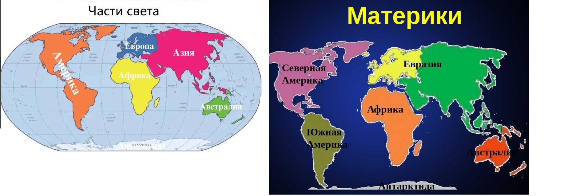 До частин світу можна віднести Америку, Африку, Австралію, Антарктиду, Європу і Азію.