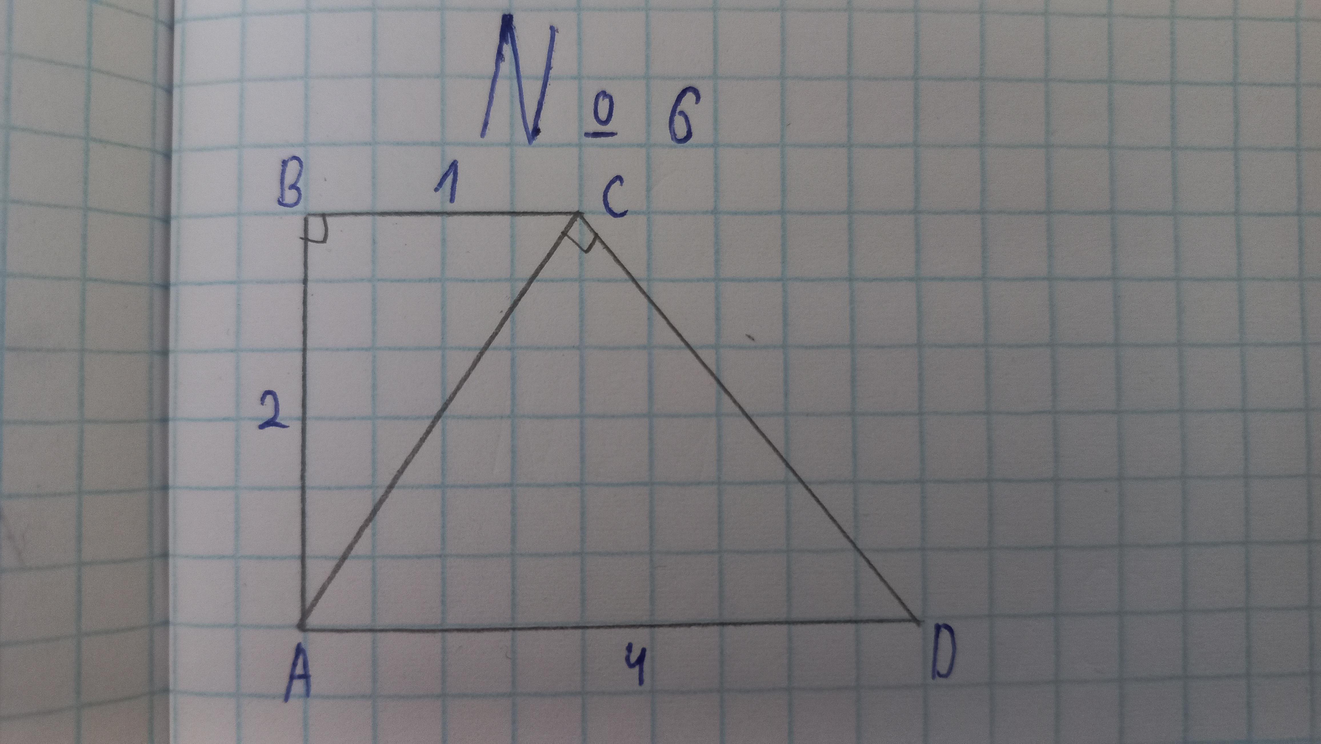 Рассмотрим рисунок. АВCD - прямоугольная трапеция. АВ =2 ед., ВС =1 ед., АD= 4 ед. Диагональ АС перпендикулярна боковой стороне CD.