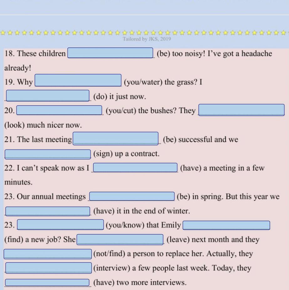 1 are,2 are you watering, have done , 3 do you cut, are looking,4 was, signed,5 am going to have,6 is, had,7 do you know, finds, will leave, won’t find, interviewed,will have