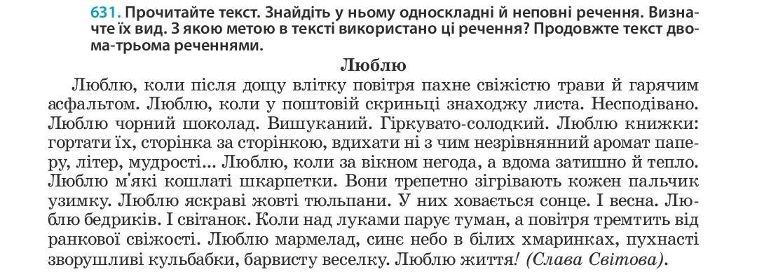 Виписати із вправи 631 односкладні речення та вказати їх типи, виписати неповні речення, написати власне продовження тексту вправи 3-4 реченнями.