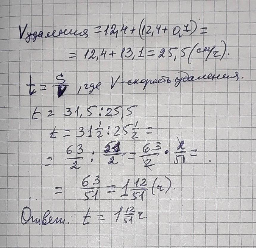 З однієї точки у протилежних напрямках одночасно почали повзти два равлики. Швидкість одного з них 12,4 см/хв, а другого – на 0,7 см/хв більша. Через скільки хвилин відстань між ними буде 31,5 см?