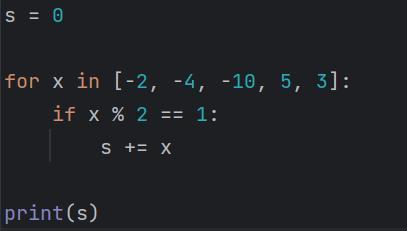 Цей код буде виводити суму всіх непарних чисел з набору {-2, -4, -10, 5, 3}, яка обчислюється змінною s