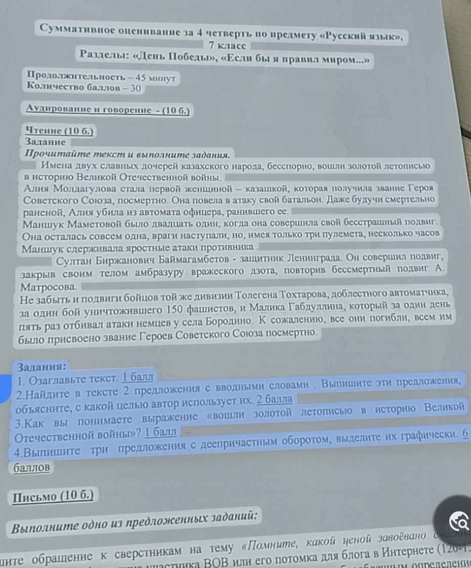 (3) Золото - это не просто драгоценный металл, а металл, который не подвержен разрушению в течение веков. Поэтому автор текста неслучайно использует эпитет «золотой», который подчёркивает не только весомый вклад казахских героев в победу в Великой Отечественной войне, но и сохранение памяти об их героизме навечно.