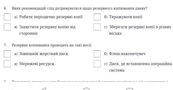 6. Яких рекомендацій слід дотримуватися щодо резервного копіювання даних? а) Робити періодично резервні копії б) Тиражувати копії в) Захистити резервну копію від сторонніх 7. Резервне копіювання проводять на такі носії: а) Зовнiшнiй жорсткий диск в) Мережеві ресурси г) зберігати резервні копії в різних мiсцях б) Флеш-накопичувач г) Диск, де встановлена операційна СИСТЕМА