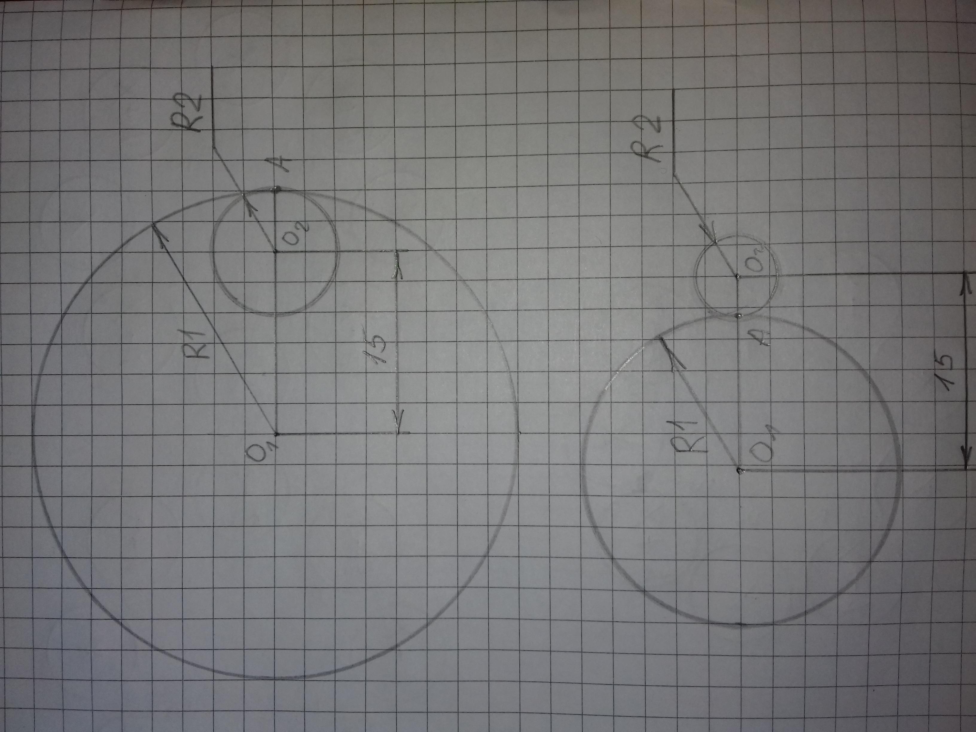 2 випадок. Меньше коло знаходиться назовні від більшого. У такому випадку точка дотикання ( А ) знаходиться між центрами обох кіл ( О1 та О2 ).