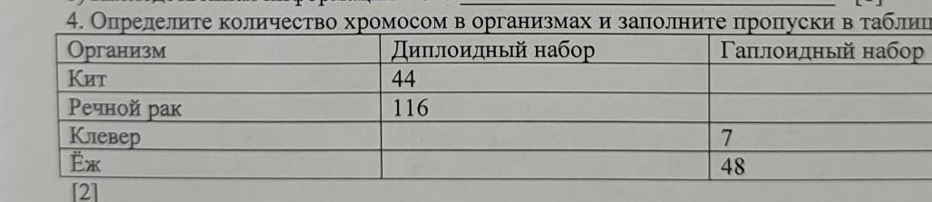 4. Определите количество хромосом в организмах и заполните пропуски в таблице Организм Диплоидный набор Гаплоидный набор Кит Речной рак Клевер Ёж [2] 44 116 7 48