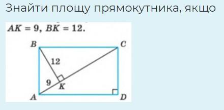 Знайти площу прямикутника, якщо AK = 9, BK = 12.
