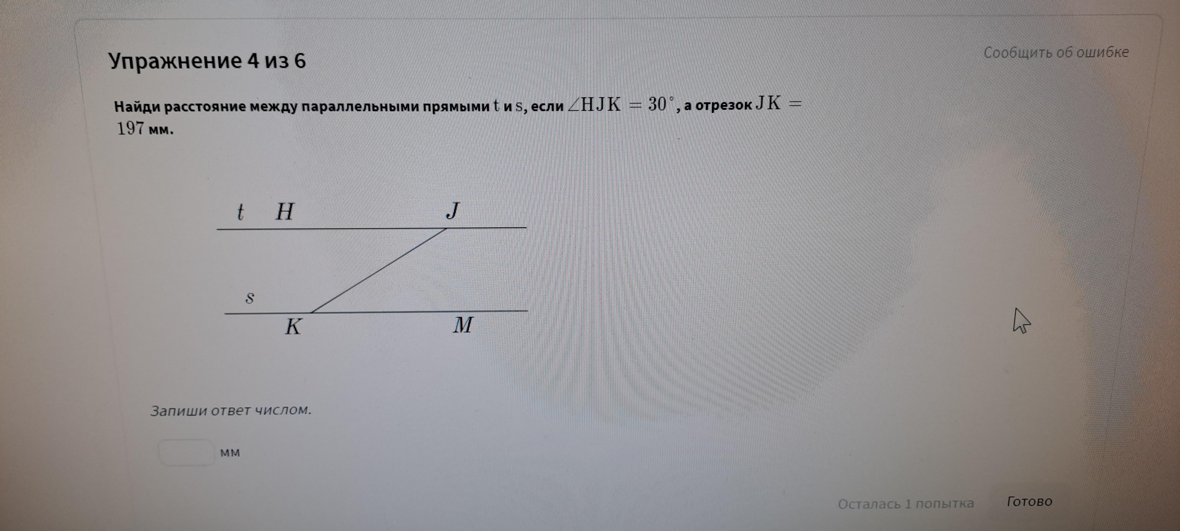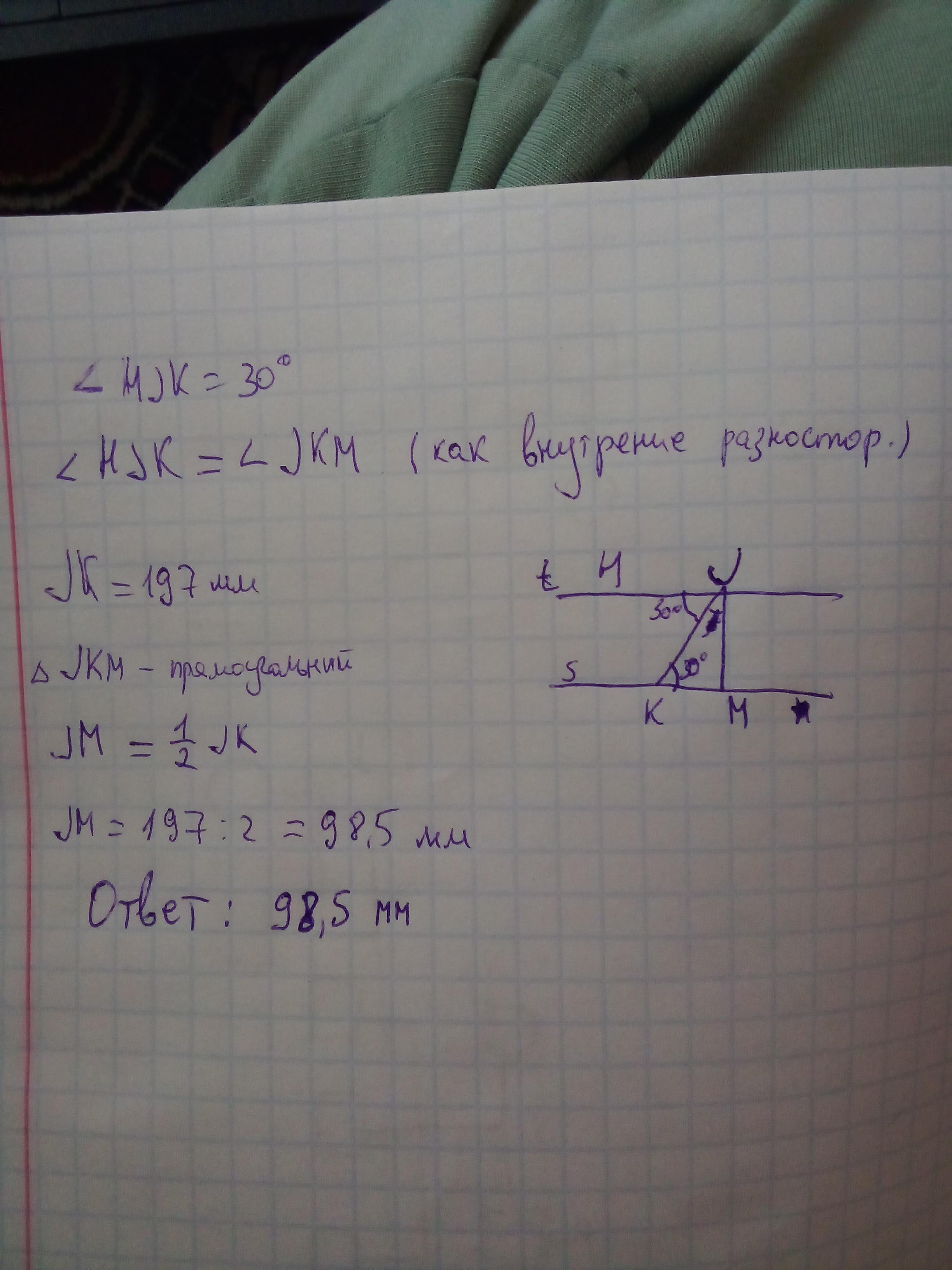 Проведём перпендикуляр( это кратчайшее расстояние между прямыми t и s)из точки К на прямую t,получился прямоугольный треугольник,катет которого(этот самый перпендикуляр) лежит напротив угла 30 градусов,поэтому катет в два раза меньше гипотенузы JK