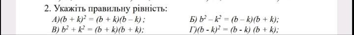 Відповідь:Б)b²-k²=(b-k)(b+k)