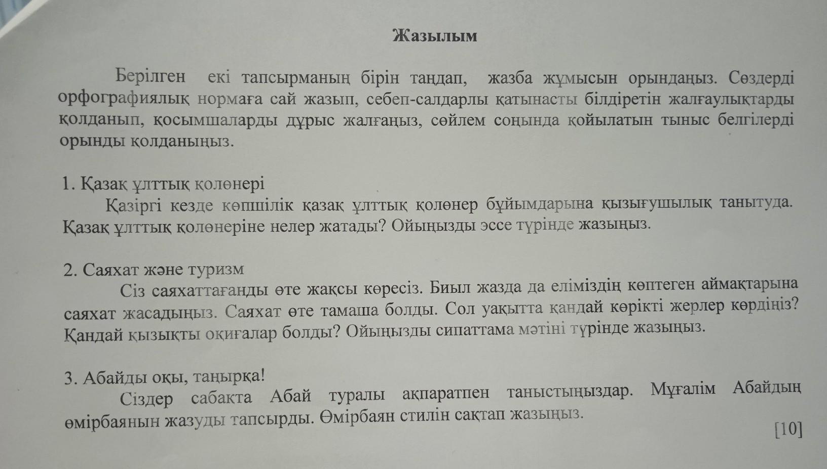 Жазылым Берiлген екі тапсырманын бiрiн тандап, жазба жумысын орынданыз. Созлерді орфографиялык нормага сай жазып, себеп-салдарлы катынасты білдіретін жалгаулыктарды колланып, косымшаларды дурыс жалганы сойлем сонында койылатын тыныс белгілерді орынды колданы 1. Казак улттык коленері Казiргi кезде копшiлiк казак улттык колонер буйымдарына кызыгушылык танытуда. Казак улттык колонерiне нелер жатады? Ойынызды эссе турiнде жазыныз. 2. Саяхат және тури м Сіз саяхаттаганды оте жаксы коресiз. Биыл жазда да елiмiздiн көптеген аймактарына саяхат жасалыныз. Саяхат оте тамаша болды. Сол уакытта кандай көрiктi жерлер көрдiнiз? Кандай кызыкты окигалар болды? Ойынызды сипаттама мәтiнi түрiнде жазыныз. 3. Абайды окы, танырка! Сiздер сабакта Абай туралы акпаратпен таныстынызлар. Мугалім Абайдын емiрбаянын жазулы тапсырды. Өмірбаян стилін сактап жазыңыз. [10] нужно 10 предложений напишите любую