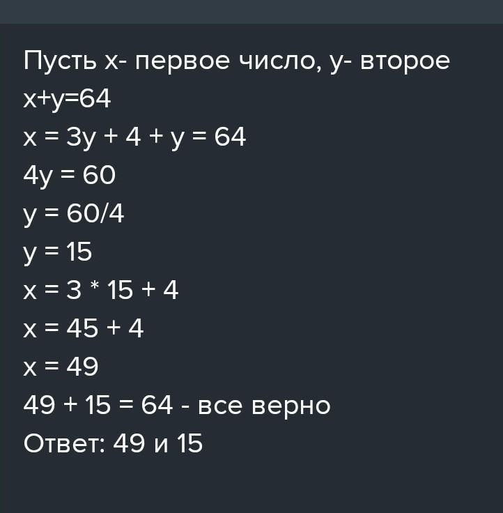 Сумма двух натуральных чисел равна 64 при делении большего числа на меньшое получается 3 и остаток 4. Найдите сумму квадратов этих чисел