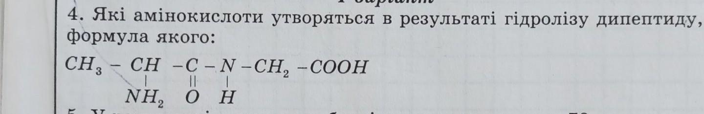 4. Які амінокислоти утворяться в результаті гідролізу дипептиду, формула якого: CH3 - CH-C-N-CH, -COOH СН3 - TI || NH2 O H