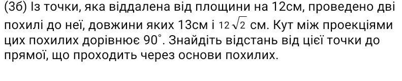 Із точки, яка віддалена від площини на 12см, проведено дві похилі до неї, довжини яких 13см і 12 ✓2см. Кут між проекціями цих похилих дорівнює 90˚. Знайдіть відстань від цієї точки до прямої, що проходить через основи похилих.