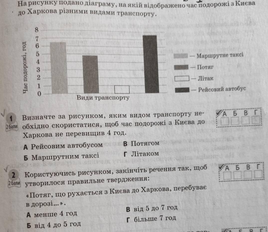 1 - На діаграмі маршрутне таксі ~6 годин, потяг - ~5 годин, рейсовий автобус ~7.5 годин. Тільки літак менше 4 годин, тому Г.