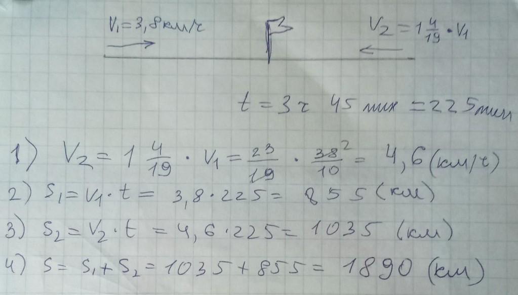 2 пешехода вышли однновремено навстречу друг к другу и встретились через 3 ч 45 мин. Скорость 1 пешехода равна 3.8 км ч второго 1 4/19 от скорости 1 пешехода.Сколько км было между пешиходами с тем самым черчежом дам 40 баллов