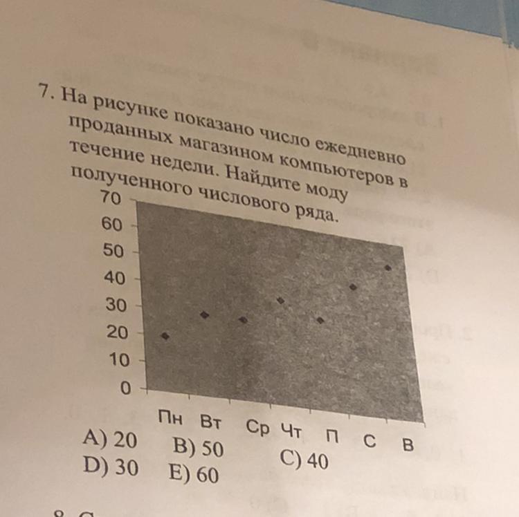 ответ d)30.Т.к во вторник,среду. и пятницу было купленно больше всего компьютеров за неделю.