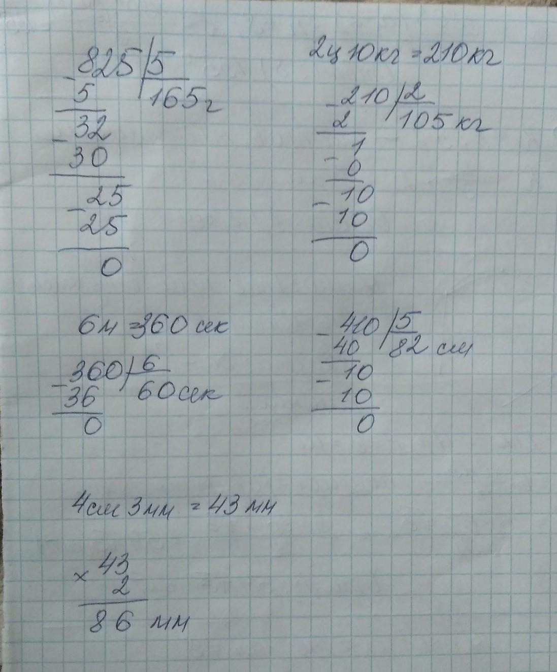 Вычисли столбиком 825г:5 2ц10кг:2 300ц:2 6мин 6с 410см:5 4см3мм•2 4