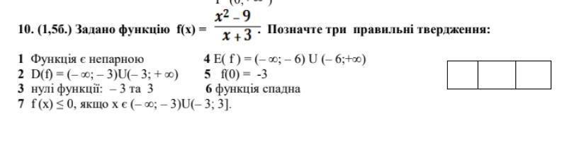 7) f(x) ≤ 0, якщо x належить (-∞, -3] U [3, +∞). Твердження неправильне, правильна умова - f(x) ≤ 0, якщо x належить (-∞, -3] U [3, ∞).